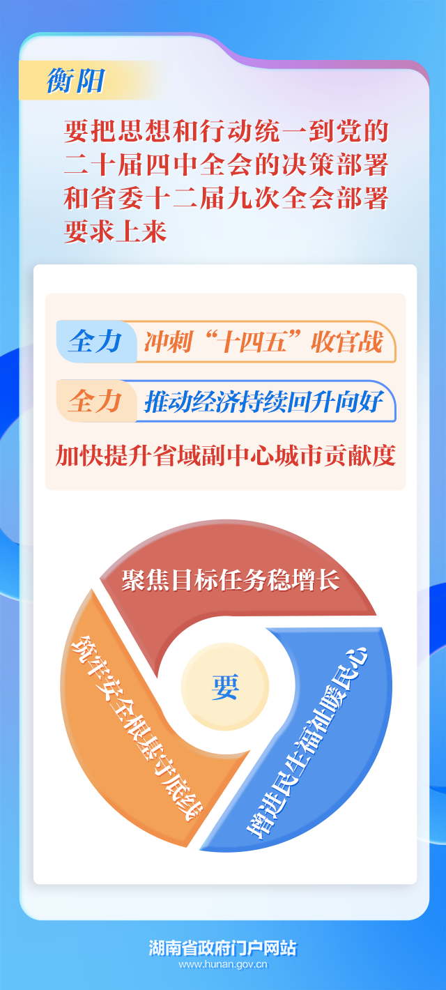 衡阳要把思想和行动统一到党的二十届四中全会的决策部署和省委十二届九次全会部署要求上来,全力冲刺“十四五”收官战,全力推动经济持续回升向好,加快提升省域副中心城市贡献度。